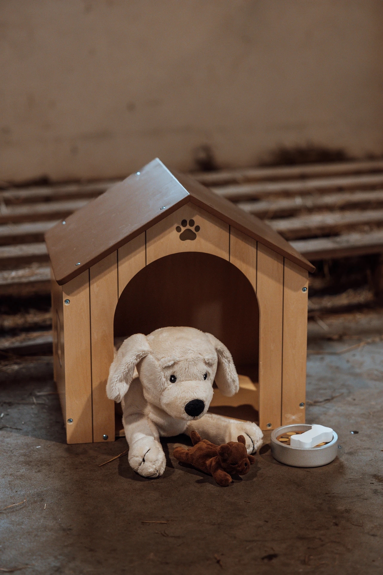 By Astrup Hundehus', det ideelle hjem til din plyshund og dens nuttede hvalpe. Komplet med foder og skål, dette charmerende hundehus inspirerer til omsorg og leg, perfekt til at nære børns fantasi og kærlighed til dyr.