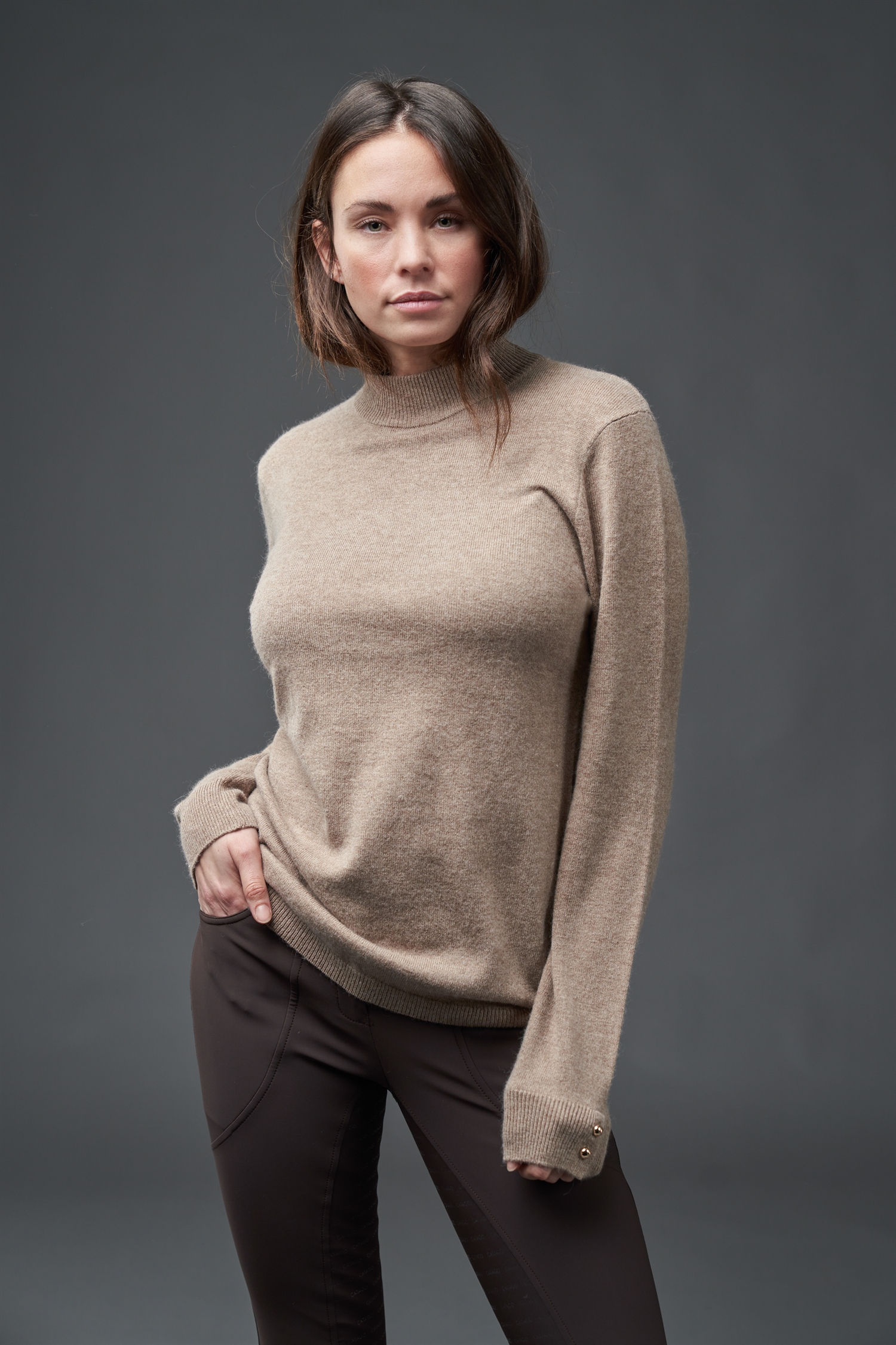 Ava strik ridebluse med en lille smule høj krave, der gør at den varmer rundt om halsen. På ærmerne har den fine rosegold knapper, der kan knappes op så ærmerne kan smøges op.