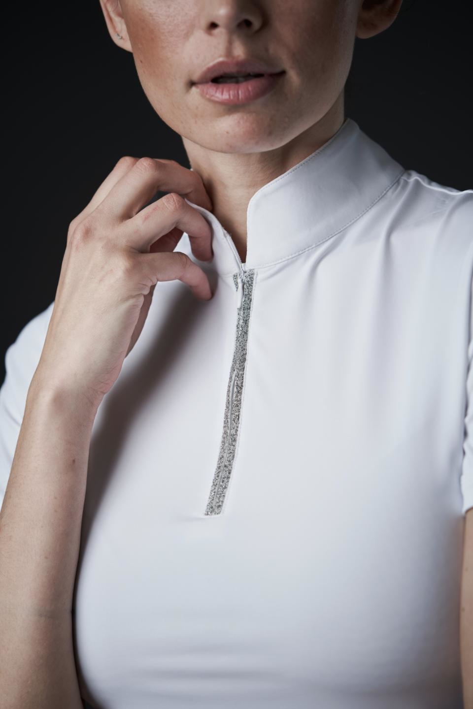 Catago Nice er den flotteste stævne ridebluse i helt hvid, med det fineste glimmer ned langs lynlåsen foran, som skinner i lyset.