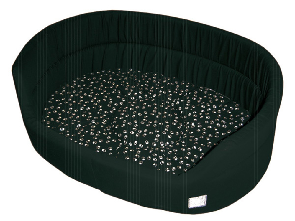 Silver Paw hundekurv i sort med sølv potemotiver. Hundekurven tilbyder komfort og holdbarhed. Kanter og ryg er udfyldt med stabilt skum, mens midten består af en blød madras. Kurven kan vaskes ved 30 grader (uldvask), uden at miste farve eller form.