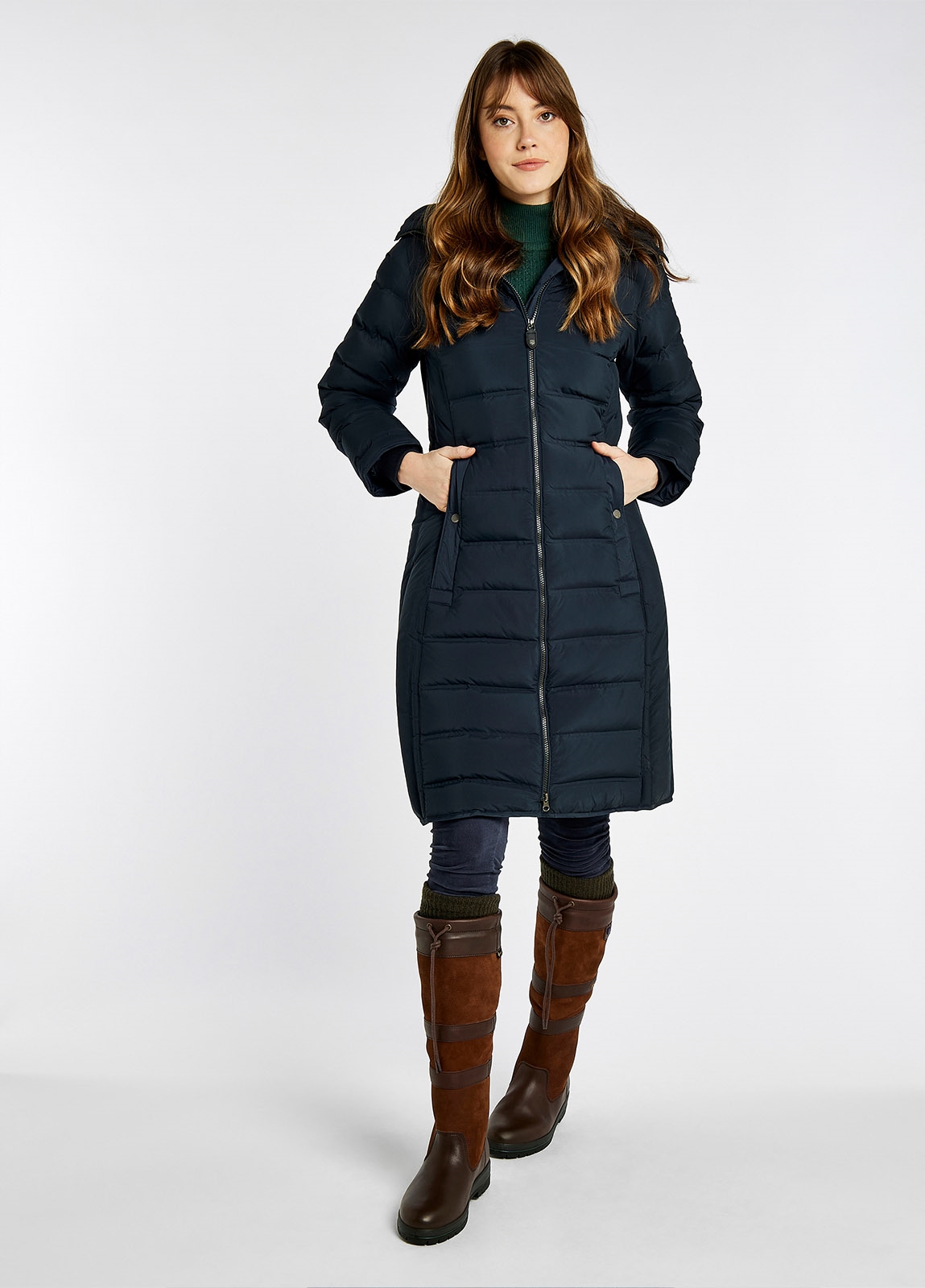 Dubarry Meyers er en flot og stilfuld knælang dunjakke i navy.