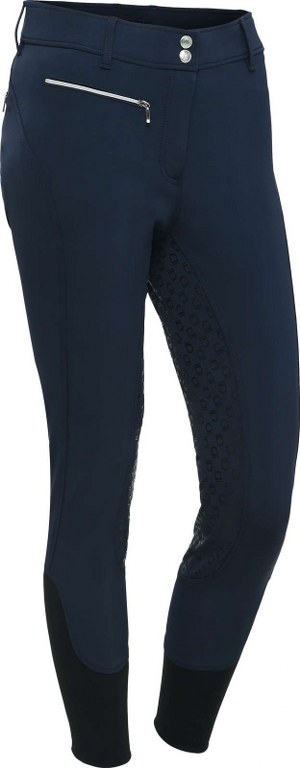 Equipage Alissa ridebukser med knæ grip. Gode ridebukser i teknisk vævet stof, der bevare pasformen godt. Alissa er normal i taljen. Knæ grip giver rytteren et godt greb i sadlen. Ridebukserne har to lommer med sølvfarvet lynlås, en foran og en bagpå.