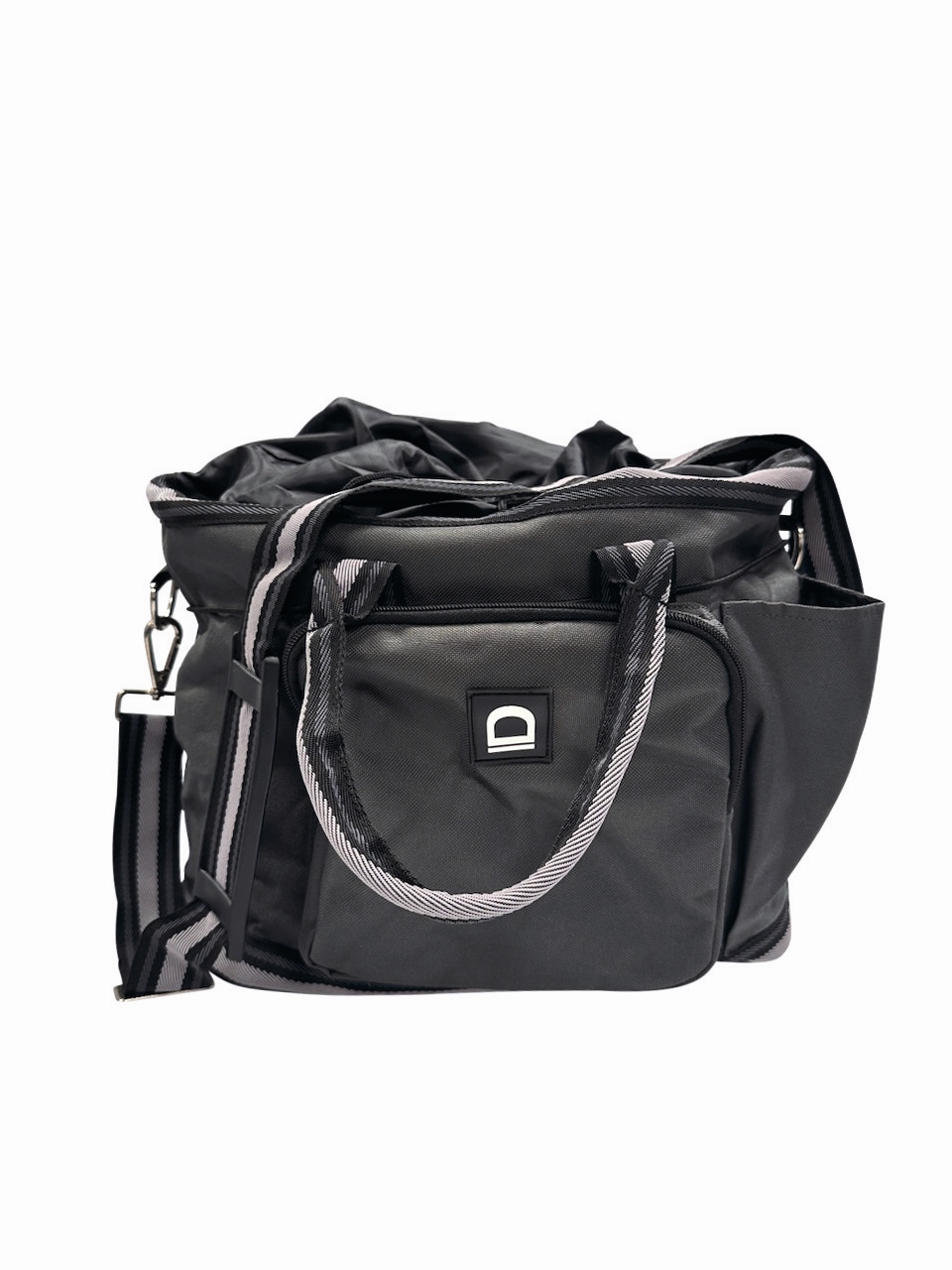 Toppen af tasken kan lukkes med en stofhætte med snoretræk, som beskytter indholdet mod snavs og støv. De stribede håndtag giver et sporty udtryk og gør tasken nem at bære i hånden, mens den matchende, justerbare skulderrem giver fleksibilitet og komfort under transport.