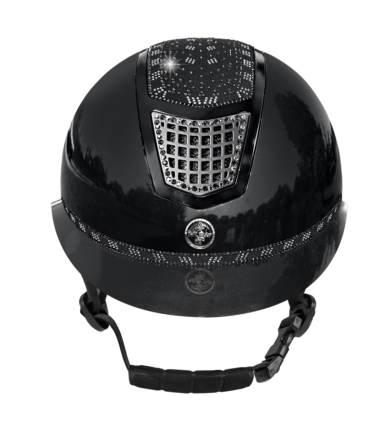 FairPlay Quantinum Eos Shiny ridehjelm i flot blank sort med glitrende krystaller på front- og bagventilationen, på toppen og frontbåndet, som changere flot i farverne.