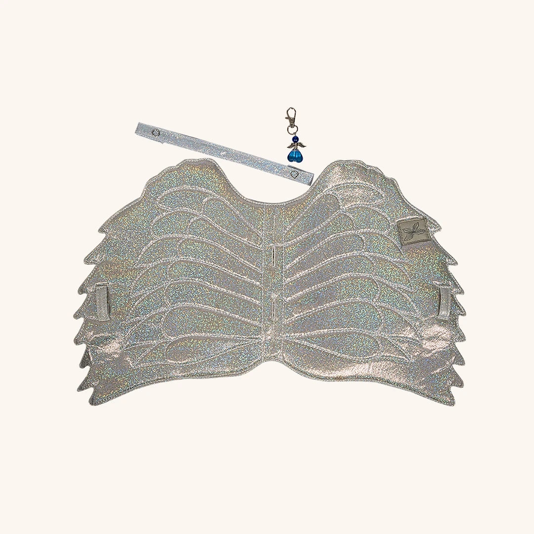 Sadelunderlaget er inspireret af engle- og enhjørningevinger og har en helt særlig form, der skiller sig ud. Det matcher perfekt med pandebåndet i glitrende stof, som giver kæphesten et eksklusivt udtryk. Den blå/sølv charm kan sættes fast på sadlen, pandebåndet eller et helt tredje sted og giver et ekstra strejf af magi.