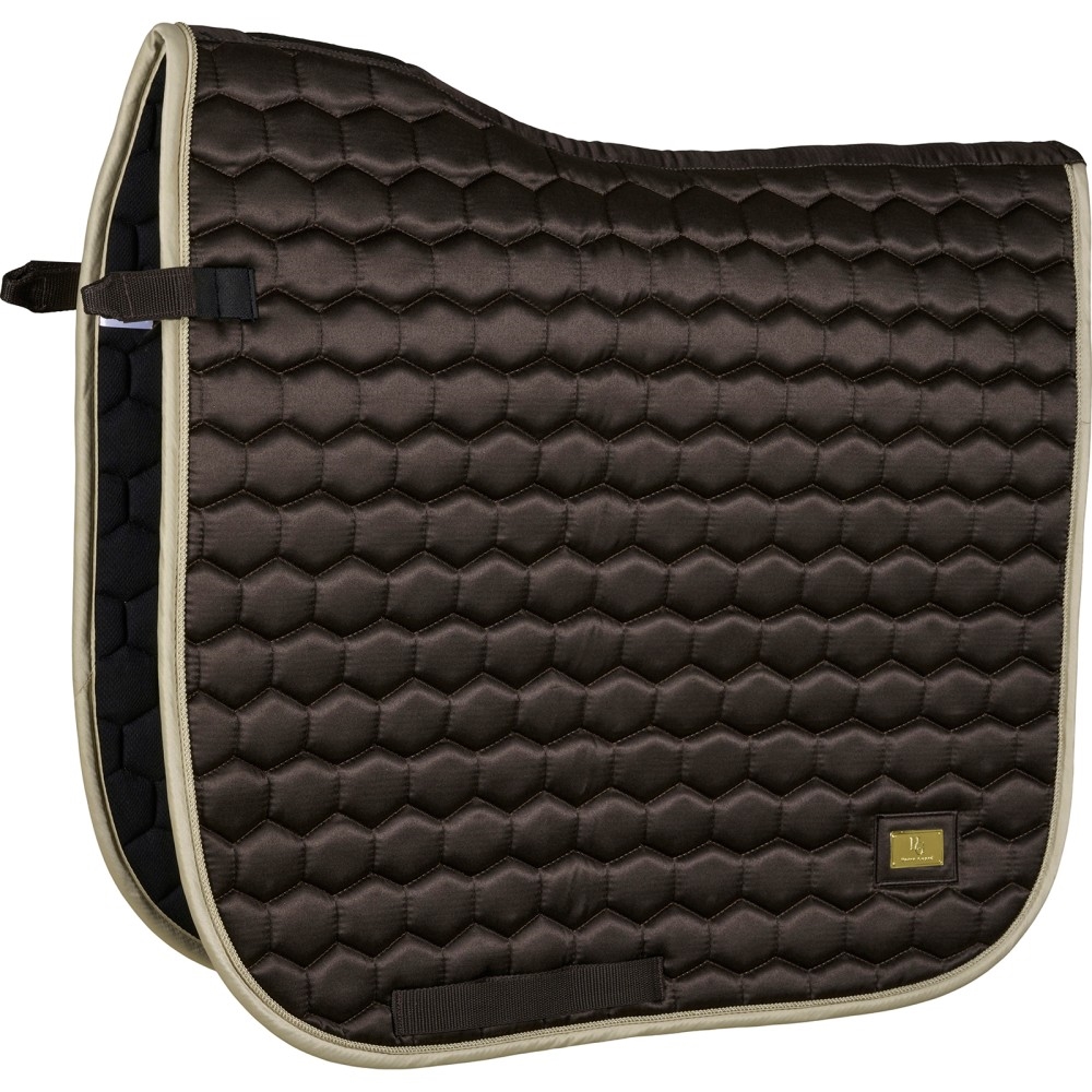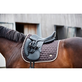Horse Guard Kora er et super flot dressur underlag i den pæneste mørkebrune farve, med creme farvet kantbånd, guld pipe og lille diskret logo på venstre side.