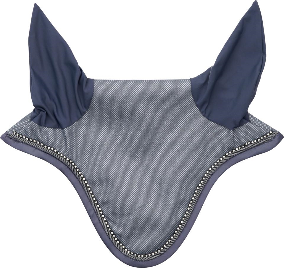 Sporty flue hut kantet med matchende piping og kontrasterende stenkrystaller. Hoveddelen er designet af en delikat netstof med en smuk skinnende underlag. Let, åndbar og hurtigtørrende for at forhindre ophobning af sved. Ørerne er designet af et strækbart polyesterjersey for komfort omkring ørerne. Matchende sadelunderlag er tilgængelige.