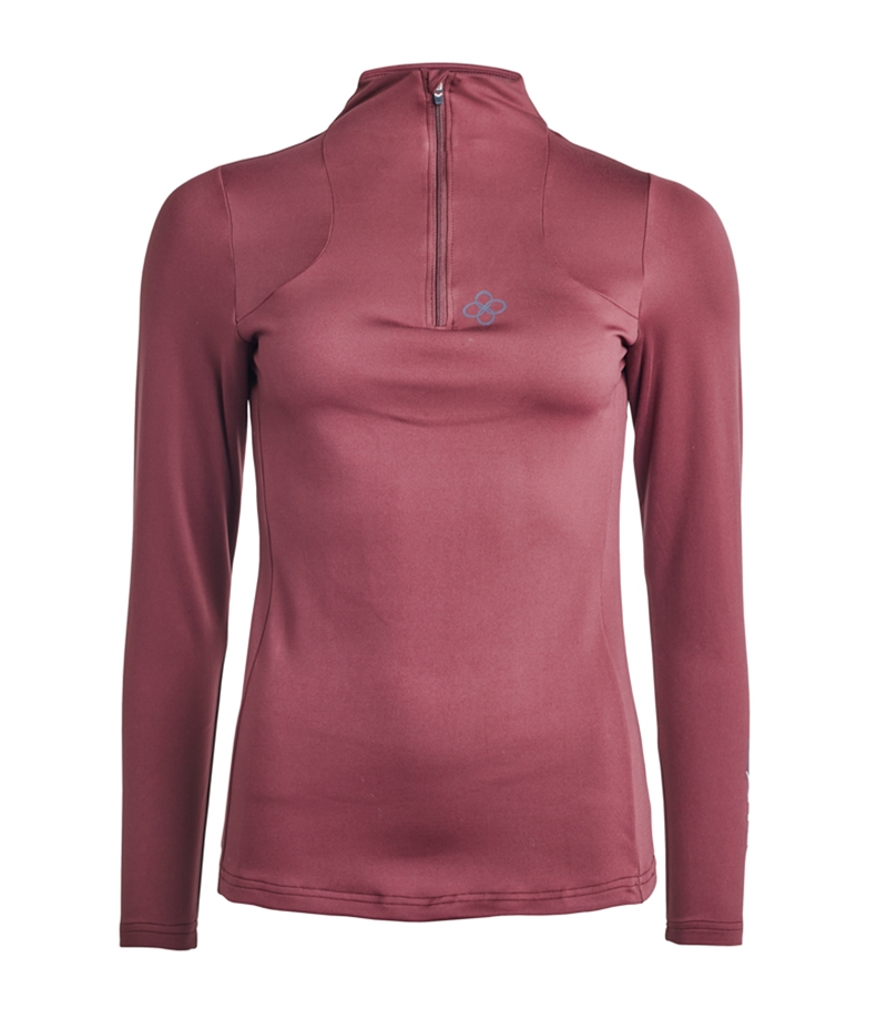 Kingsland Earth Sorena er en virkelig flot mørk bordeaux rød ladies fitted træningsbluse, med lange ærmer og høj krave med lynlås.