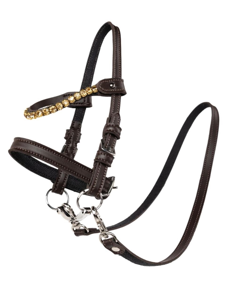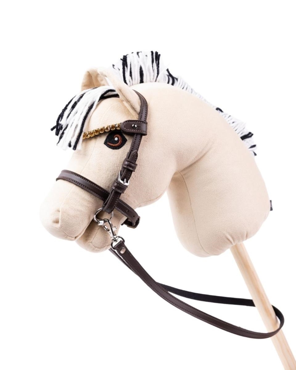 Oplev den elegante My Hobby Horse Trense - Brun med guldsten  Perfekt til din kæphest, denne trense kombinerer holdbarhed med stil med sine justerbare spænder og skinnende sølvsten. Inkluderer tøjler og et udskifteligt pandebånd for nem tilpasning.