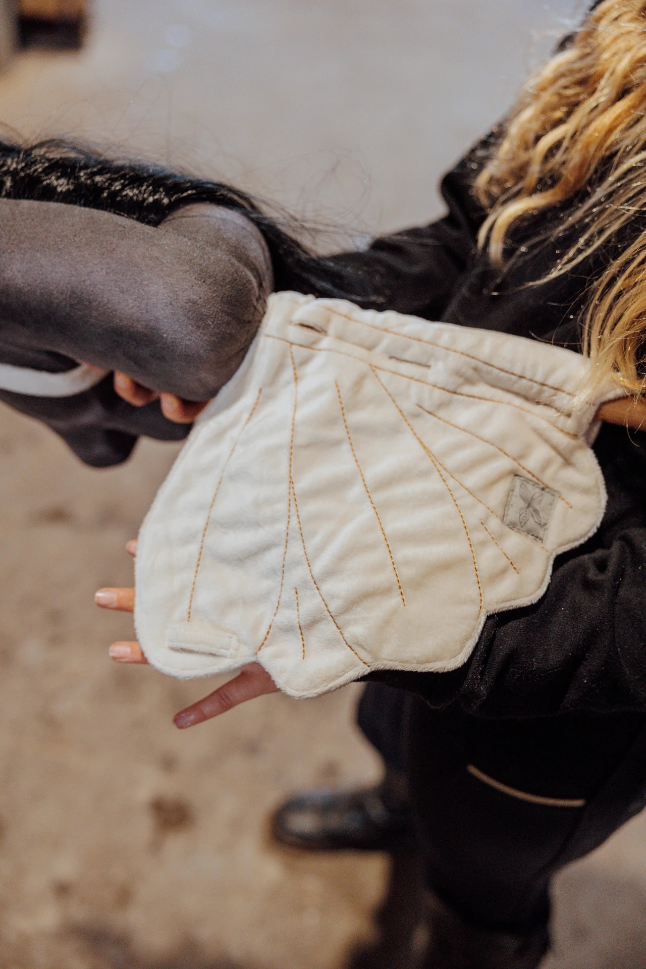 Inspirationen fra sommerfuglevingernes delikate elegance ses i sadelunderlagets form og detaljer, der giver et unikt og iøjnefaldende udtryk. Den matchende hut fuldender looket, så kæphesten står knivskarpt til både dressurstævner og fritidsridning i arenaen.