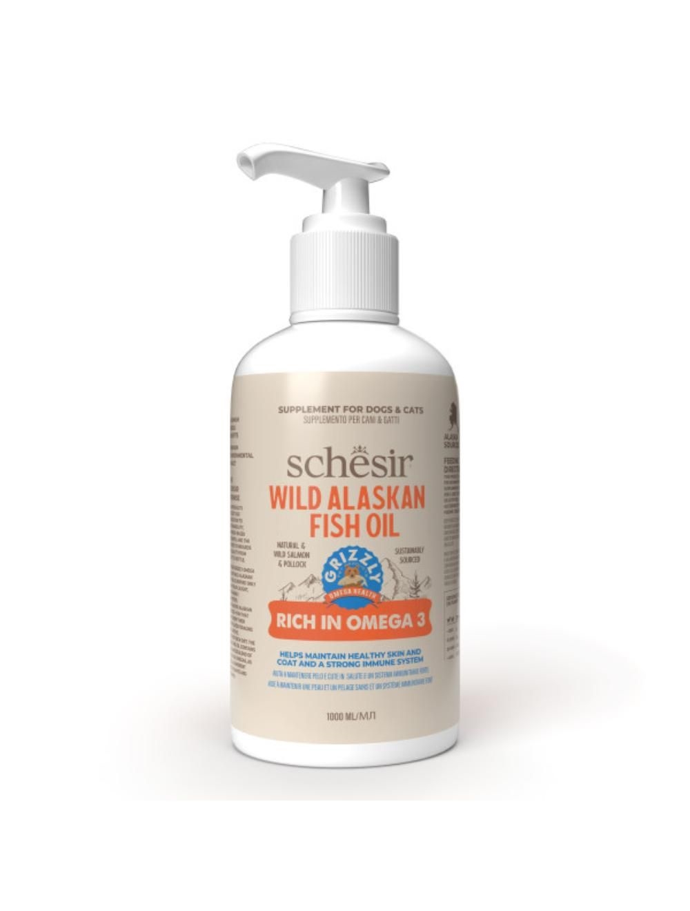 Schesir Grizzly Wild Lakseolie er et førsteklasses kosttilskud til hunde og katte, udviklet i samarbejde med Grizzly, som har været et betroet navn inden for omega-sundhed siden 2002.