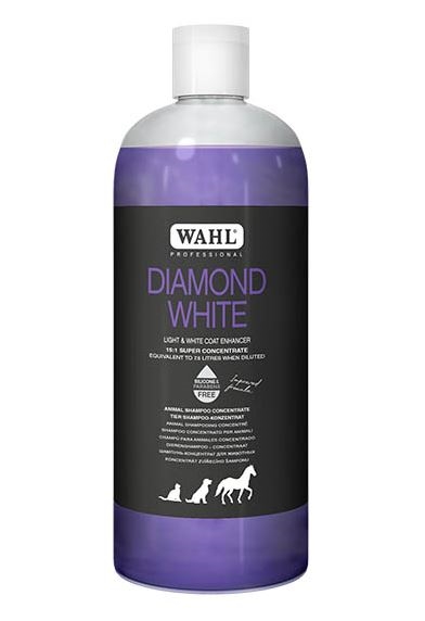 Wahl Diamond White Shampooen fremhæver de hvide og lyse hestes pels, og efterlader dem blanke og bløde.