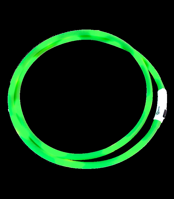 Halsringen er i blød og fleksible gummi, og genoplades nemt med et USB stik.