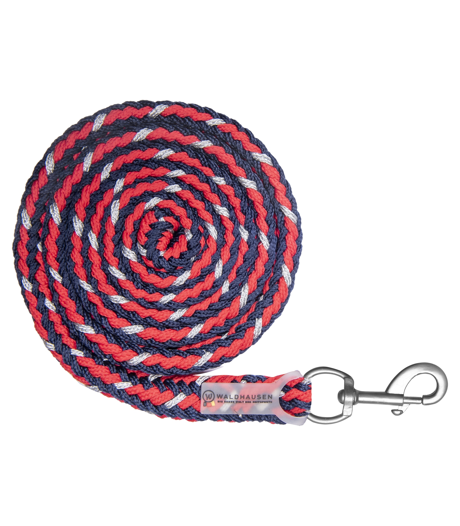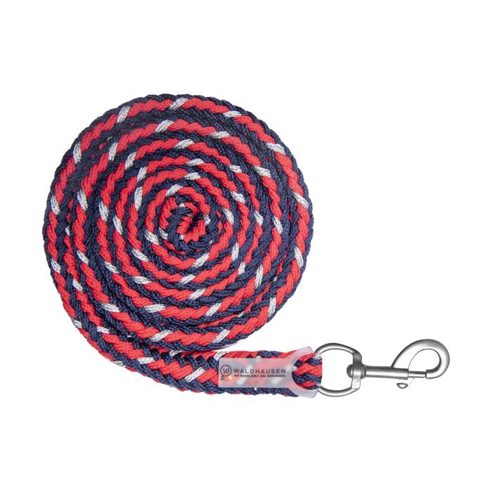 Træktov i god kvalitet med silver karabinhage. Flot farve med navy, rød og sølv flet.